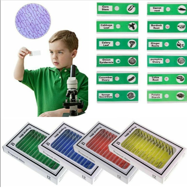 Kit de Lâminas Preparadas para estudos didáticos com 48 peças. Indicadas para o Ensino Fundamental.