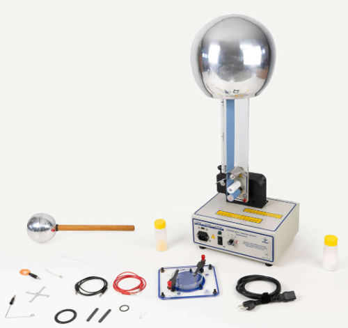 Destinado ao estudo, laboratório de física, experimentos de física sobre: Eletricidade. O eletrodo cátodo e o eletrodo ânodo no gerador de Van de Graaff. A rigidez dielétrica de um material. A condutividade elétrica de um material. A condutividade de um gás. Os gases, condutores de terceira espécie. Configurações das linhas de força entre eletrodos, o para-raios, a gaiola de Faraday e o cabo coaxial. O campo elétrico. Analogia entre o campo gravitacional terrestre e o campo elétrico, campos conservativos. Michael Faraday, linhas de força e o vetor campo elétrico entre dois eletrodos. O que é uma linha de força de um campo elétrico. Propriedades das linhas de força do campo elétrico. As linhas de força entre um par de eletrodos retos e paralelos com cargas elétricas de sinais contrários. As linhas de força entre um par de eletrodos pontuais com cargas elétricas de sinais contrários. Linhas de força entre um eletrodo em anel e um eletrodo pontual centrado, com cargas elétricas de sinais contrários. As linhas de força entre um eletrodo reto e um eletrodo pontual com cargas elétricas de sinais contrários. Linhas de força entre dois eletrodos retos com cargas de sinais contrários e um anel entre eles, a gaiola de Faraday, a blindagem eletrostática. O potencial elétrico e a quantidade de carga acumulada no gerador. O potencial elétrico e o trabalho para deslocar uma carga elétrica. A unidade de carga elétrica natural e a quantidade de carga elétrica. A densidade superficial de carga. A medida do potencial na superfície externa da esfera do gerador. A medida da densidade superficial de carga da esfera do gerador. A extensão da centelha no gerador Van de Graaff e a rigidez dielétrica. A avaliação da extensão da centelha produzida pelo gerador e alguns fatores que podem intervir. O princípio do funcionamento do eletroscópio de folhas e a distribuição de cargas em um condutor. Acendendo uma lâmpada néon sem contato com o gerador. Acendendo lâmpada fluorescente sem contato com o gerador. Fazendo um chafariz elétrico. Tiras de papel que se repelem, com o gerador. Simulando um para-raios com o gerador. Arrepiando os cabelos com o gerador eletrostático. O torniquete, efeito do vento elétrico, com o gerador, etc.