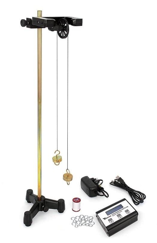 Composto por tripé, hastes acopláveis, roldana raiada rolamentada, cronômetro e sensor (depende da versão escolhida), massas aferidas e etc.